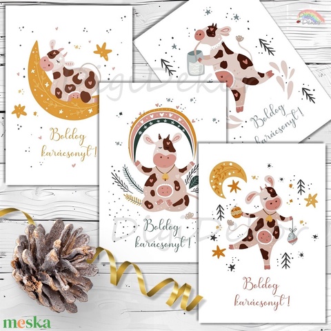 Karácsonyi képeslapok vidám tehenekkel. 4 db-os csomag.