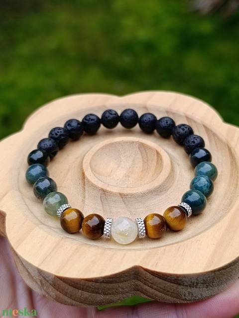 - Anyaga: gumis damil, citrin, mohaachát, tigrisszem, lávakő, nemesacél