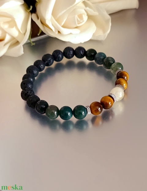 - Anyag/Összetevő gumis damil, citrin, mohaachát, tigrisszem, lávakő, nemesacél