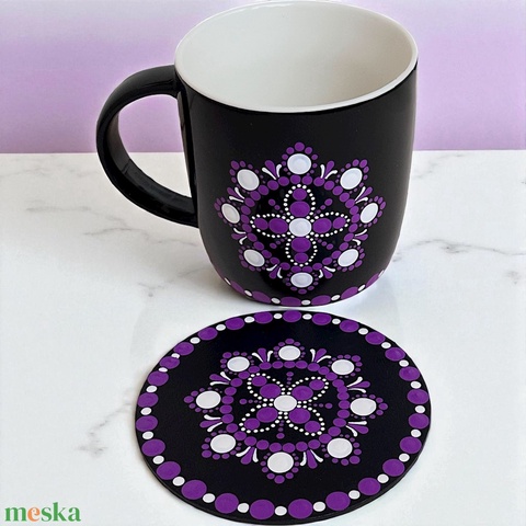 3,3 decis kerámia bögre és fa poháralátét szett szatén fényű lila és fehér színekkel festett pontmandalával