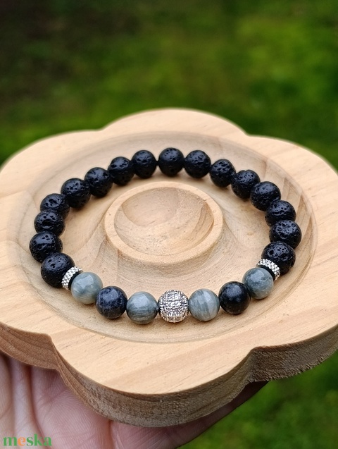 Sasszem, larvikit és lávakő karkötő cirkónia díszgömbbel – tisztánlátás, védelem és erő