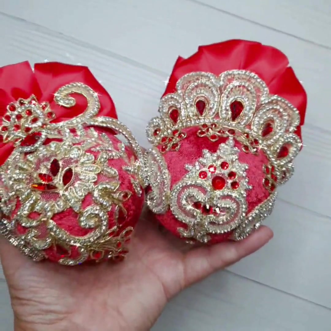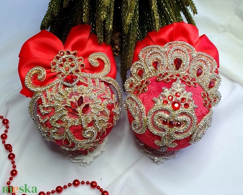 karácsony, karácsonyi lakásdekoráció, karácsonyfadíszek, dísz, gömb, kézműves, elegáns, piros, bársony, ajándék, dekoráció, karácsonyfa, szett, xmas, 2darab, ünnepi, lakás, kiegészítő, design, stílus, fény, varázs, művészet, ajándékdoboz, strassz, masni, dekor