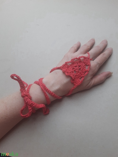 100 % pamutfonalból horgoltam, a sötét rózsaszín színű kézdíszt, amely nem piros, ahogy a képen látszik. Kéz, illetve lábdísz egyben, kinek hova tetszik. :)