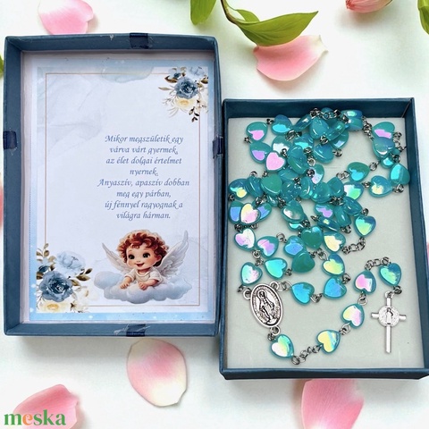 Keresztelő ajándék öttizedes rózsafüzér díszdobozban kísérő szöveggel fiú gyermeknek