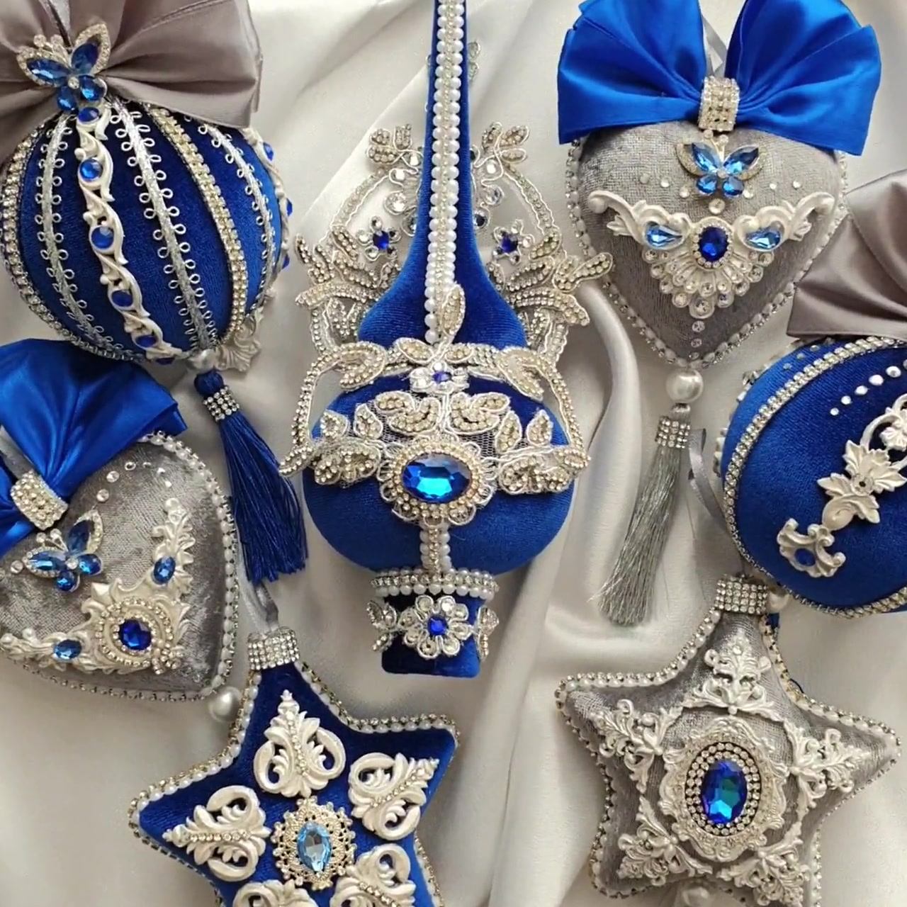 6 darabos kézzel készített szürke bársony karácsonyfadísz szett – 4 gömb és 2 szív kék masnival Xmas dekoráció