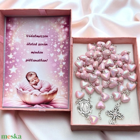 Keresztelő ajándék öttizedes rózsafüzér díszdobozban kísérő szöveggel lány gyermeknek 5633926