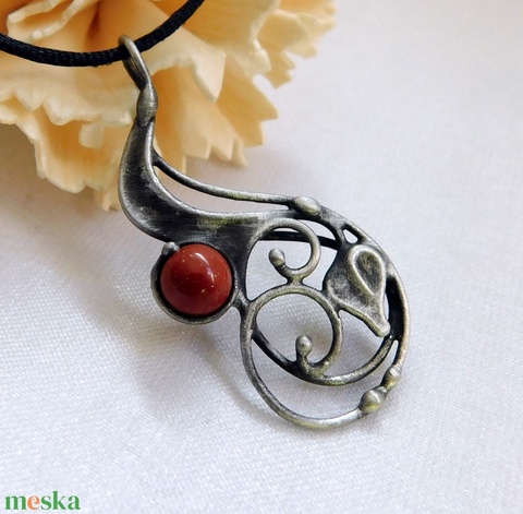 A medál Tiffany technikával készült vörös jáspis, réz és ólommentes, ezüsttartalmú ón felhasználásával. A diszítés szintén saját készítésü, nem tartalmaz gyári elemeket. A fémrészt óezüstre patináztam és lelakkoztam, hogy sokáig szép maradjon.