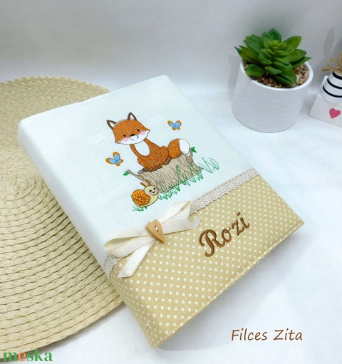 Rókás, csigás hímzett fotóalbum névvel - textil fényképalbum hímzett névvel