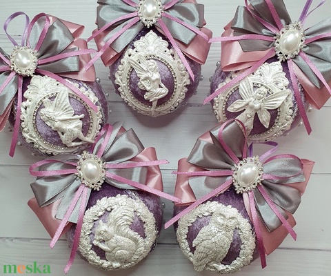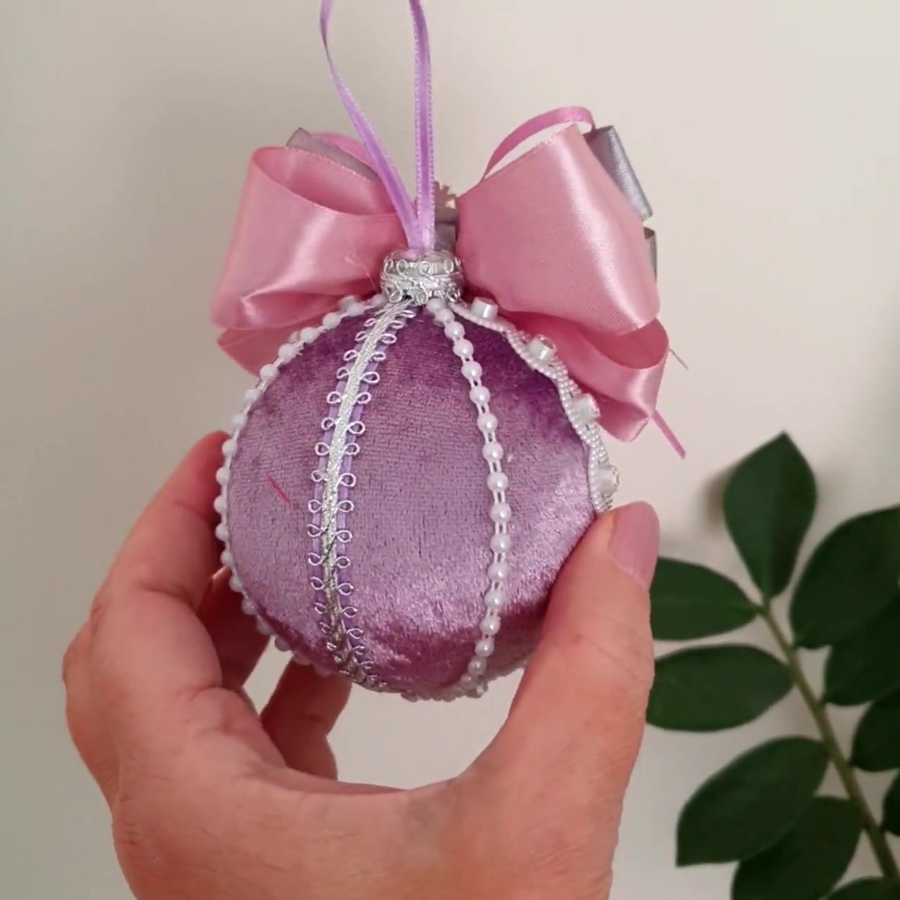 6 darabos kézzel készített világos lila bársony karácsonyi dísz szett – 5 gömb és 1 csúcsdísz Xmas dekoráció