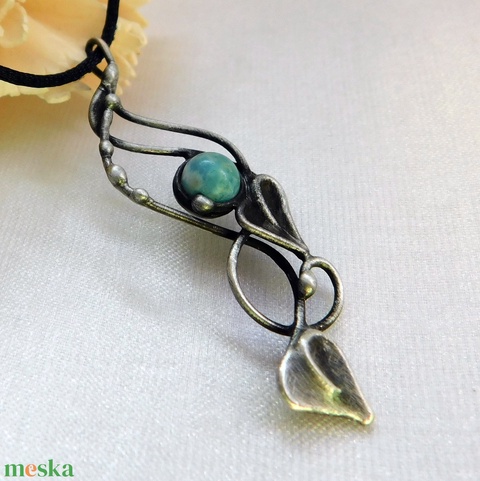 A medál Tiffany technikával készült apatit, réz és ólommentes, ezüsttartalmú ón felhasználásával. A díszítés szintén saját készítésű, nem tartalmaz gyári elemeket. A fémrészt óezüstre patináztam és lelakkoztam, hogy sokáig szép maradjon.
