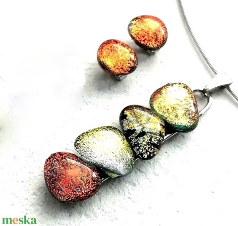 AKCIÓ! NEMESACÉL! Vörös-arany kavicsok dichroic üvegékszer szett.