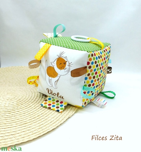 Cicás hímzett babakocka- textil mókakocka hímzett névvel - cicás babaköszöntő ajándék