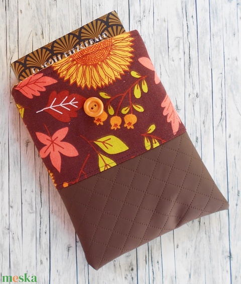 Gesztenyebarna alapon színes őszi levél, bogyó és napraforgó mintás könyvtok