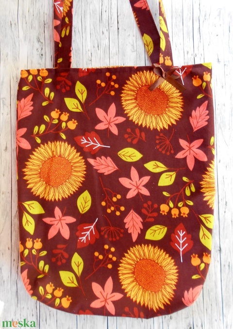 Gesztenyebarna alapon színes őszi levél, bogyó és napraforgó mintás bevásárló táska/szatyor