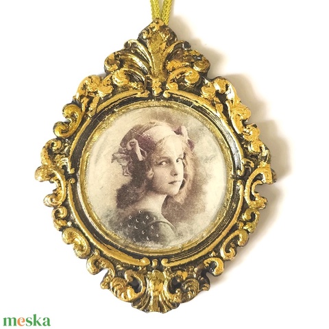 Barokk stílusú karácsonyfadísz leány portréval, öntött kerámia