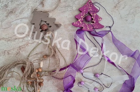 Fenyőfa, fa akasztós ajtódísz, karácsonyi dekorációs alapanyag, natúr barna, lila színben