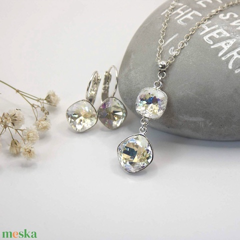 Nyaklánc és fülbevaló szett gyémánt színű Swarovski kristályok felhasználásával, lekerekített négyszög foglalatokban