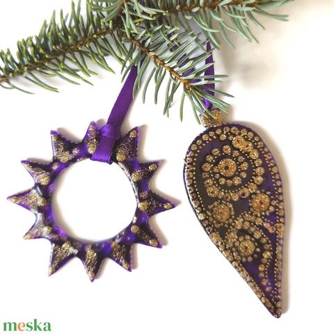 Lila csillag és csepp formájú üveg karácsonyfadísz arany diszítéssel