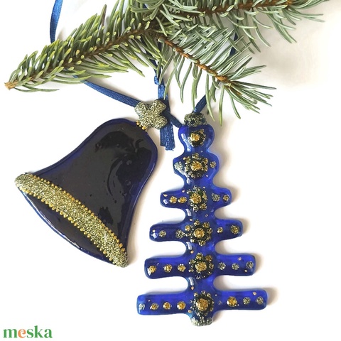 Kék harang és fenyőfa üveg karácsonyfadísz