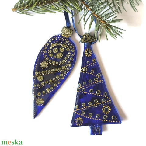 Csepp és fenyőfa kék üveg karácsonyfadísz arany díszítéssel