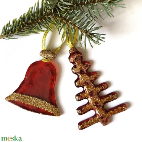Piros harang és fenyőfa üveg karácsonyfadísz arannyal díszítve