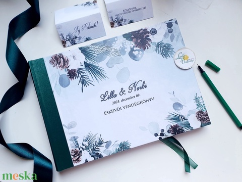 Téli esküvőre vendégkönyv, sötétzöld, fenyőág, toboz, Esküvői Emlékkönyv