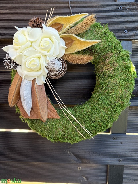 - Anyaga: mohakoszorú, szárazvirágok, habrózsák