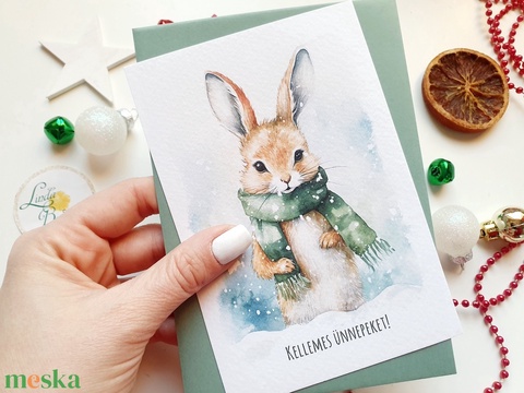 Nyuszis, Zöld, Karácsonyi Képeslap, Állatos, Adventi lap, kinyithatós képeslap A6 méret borítékkal