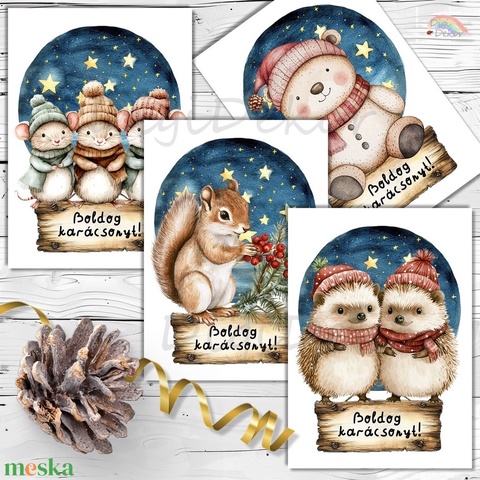 Karácsonyi üdvözlőlapok aranyos állatokkal.