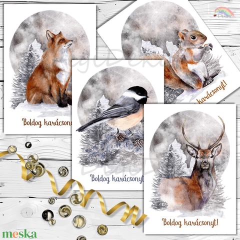 Gyönyörű karácsonyi képeslapok téli állatokkal. 4 db-os csomag.