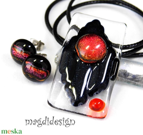 Fekete-vörös cikk-cakk üvegékszer szett nyaklánc stiftes fülbevaló