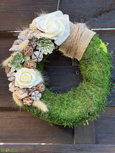 - Anyaga: mohakoszorú, szárazvirágok, habrózsák