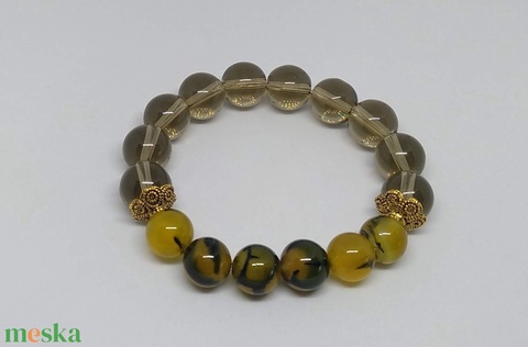 Sárga-fekete sárkányvéna achát és füst színű kristály karkötő