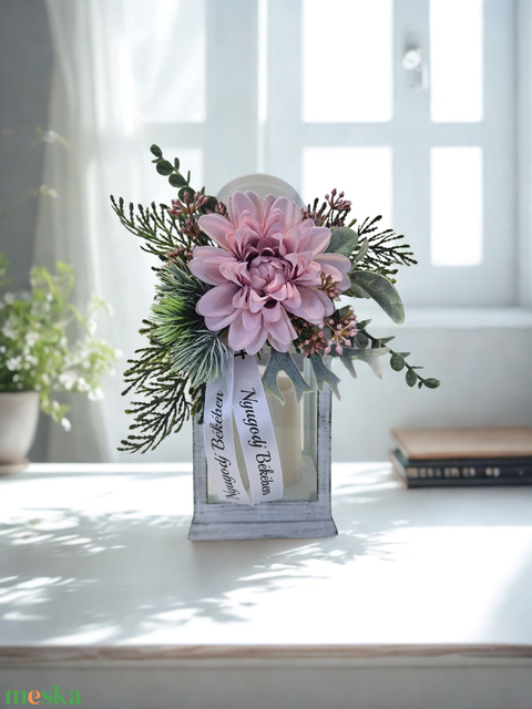 LED-es lámpás kegyeleti dísz pasztell lila dáliával