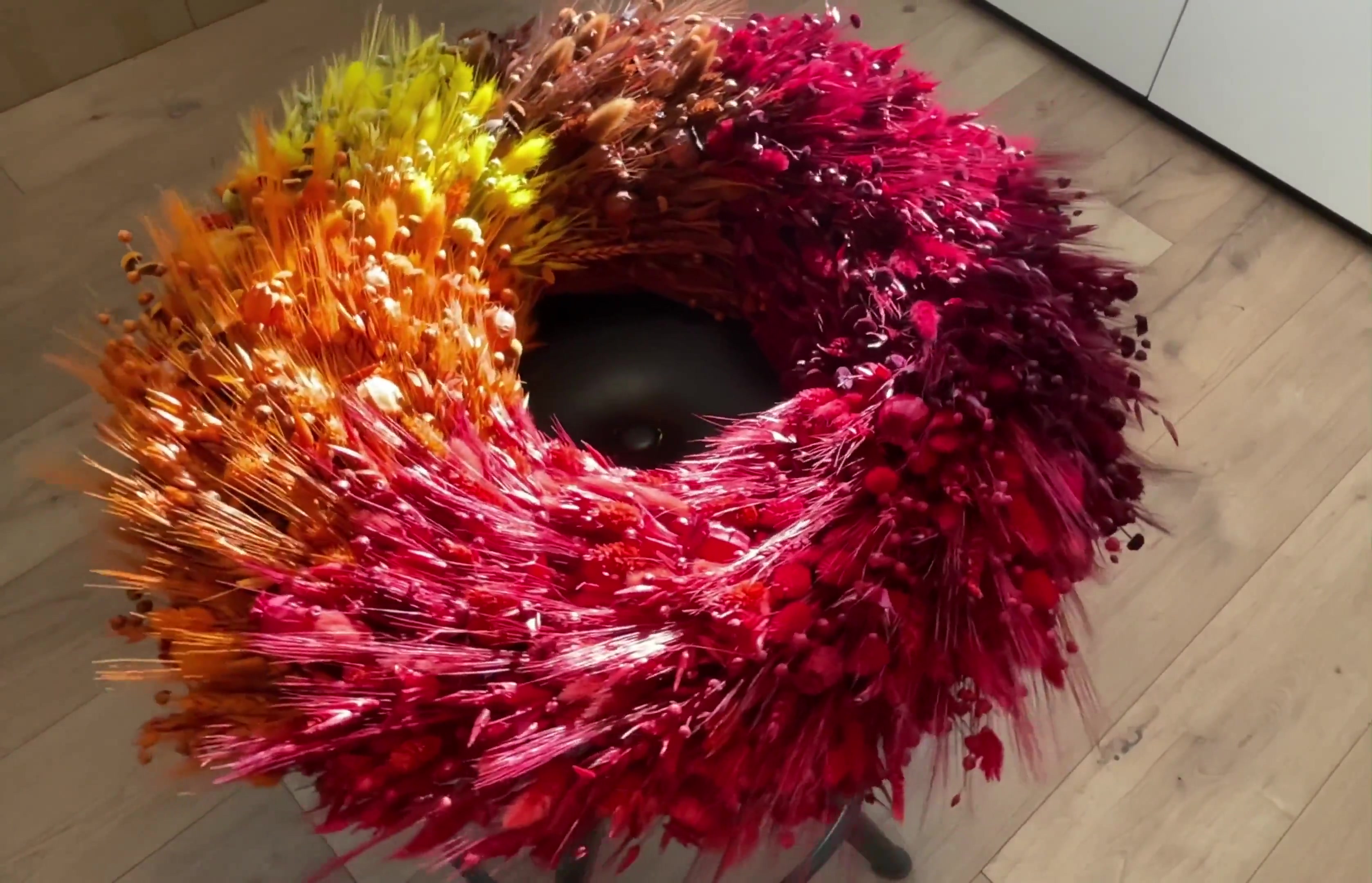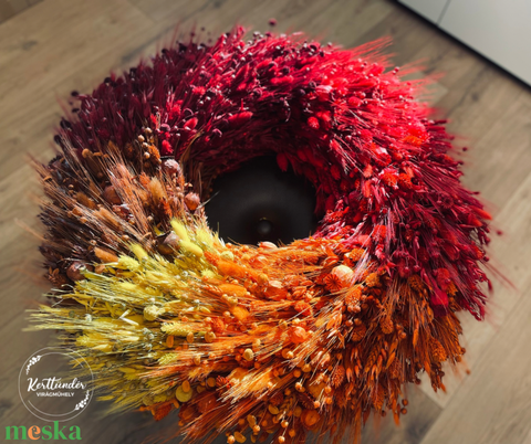 - Anyaga: szalma alap, drót, szárazvirágok, kenderzsineg, selyemszalag