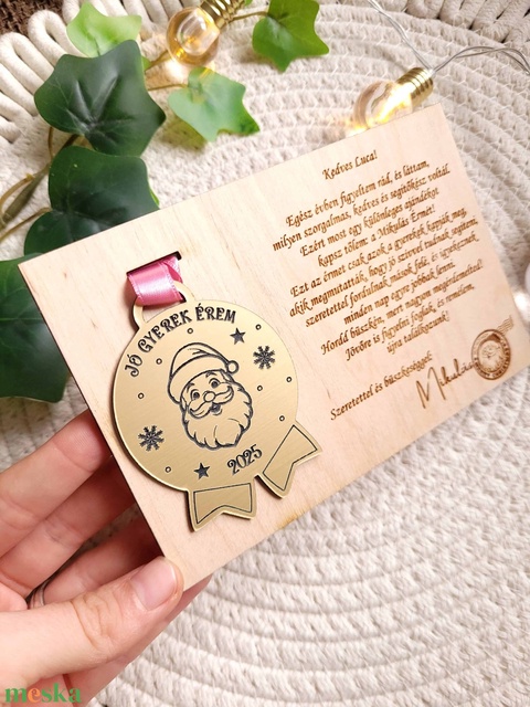 A csomagban egy fából készült kísérőkártya és egy arany színű „Jó gyerek” érem található – tökéletes ajándék a mikuláscsomag kiegészítéseként vagy önálló meglepetésként.