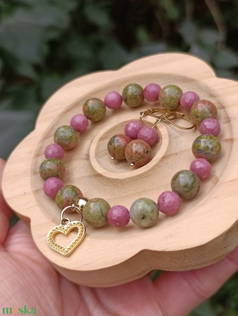 Szívgyógyító ásványkarkötő és fülbevaló unakittal és thulittal