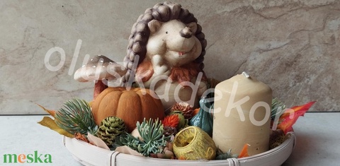 Sünis őszi asztaldísz, gyertyával, növényekkel, termésekkel, 19cm x 14cm