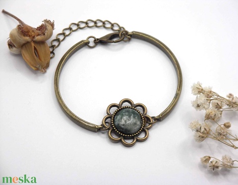 Virág formájú, zöldes-márványos kaboson, bronz színű karkötőn – Marble