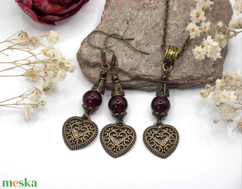 Gránát ásványgyöngyökkel és áttört mintás, szív alakú charmokból készült nyaklánc és fülbevaló szett - Mámor