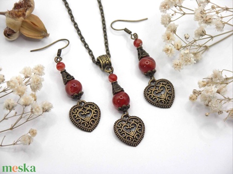 Narancs karneol ásványgyöngyökkel és áttört mintás, szív alakú charmokból készült nyaklánc és fülbevaló szett - Őszidő