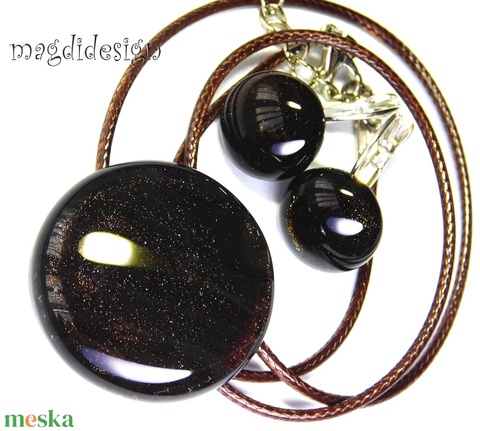 Trendi barna selyemfény üvegékszer szett, nyaklánc, kapcsos fülbevaló