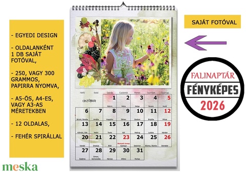 2026-os egyedi fényképes falinaptár nagyiknak, nagyszülőknek. Különleges tervezésű falinaptárammal szeretnék hozzájárulni az ajándékozás öröméhez. Vásárlásod után e-mailben megküldött visszaigazolásban fogom megírni neked, a naptár elkészítésének teljes menetét. Abban találod majd az elszámolást is, melyet előreutalással kell rendezned. A falinaptár 2 féle minőségben és 3 féle méretben (A5, A4, A3) készül. Mindkét minőség kiváló, 250 grammos, vagy 300 grammos papírra nyomódik, év végén sem fog a faltól felgöngyölődni. A falinaptár 12 oldalas, attól a hónaptól indul amelyikkel szeretnéd. Előlap külön ár ellenében kérhető! (450.-Ft/oldal) Szükséges fotók száma: 12 db