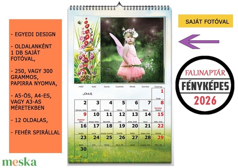 2026-os egyedi fényképes falinaptár nagyiknak, nagyszülőknek. Különleges tervezésű falinaptárammal szeretnék hozzájárulni az ajándékozás öröméhez. Vásárlásod után e-mailben megküldött visszaigazolásban fogom megírni neked, a naptár elkészítésének teljes menetét. Abban találod majd az elszámolást is, melyet előreutalással kell rendezned. A falinaptár 2 féle minőségben és 3 féle méretben (A5, A4, A3) készül. Mindkét minőség kiváló, 250 grammos, vagy 300 grammos papírra nyomódik, év végén sem fog a faltól felgöngyölődni. A falinaptár 12 oldalas, attól a hónaptól indul amelyikkel szeretnéd. Előlap külön ár ellenében kérhető! (450.-Ft/oldal) Szükséges fotók száma: 12 db