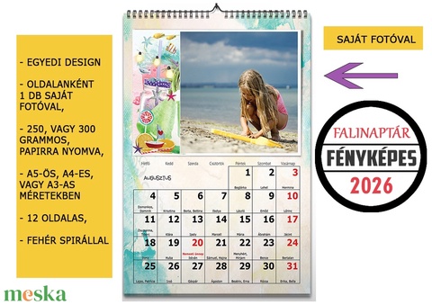 2026-os egyedi fényképes falinaptár nagyiknak, nagyszülőknek. Különleges tervezésű falinaptárammal szeretnék hozzájárulni az ajándékozás öröméhez. Vásárlásod után e-mailben megküldött visszaigazolásban fogom megírni neked, a naptár elkészítésének teljes menetét. Abban találod majd az elszámolást is, melyet előreutalással kell rendezned. A falinaptár 2 féle minőségben és 3 féle méretben (A5, A4, A3) készül. Mindkét minőség kiváló, 250 grammos, vagy 300 grammos papírra nyomódik, év végén sem fog a faltól felgöngyölődni. A falinaptár 12 oldalas, attól a hónaptól indul amelyikkel szeretnéd. Előlap külön ár ellenében kérhető! (450.-Ft/oldal) Szükséges fotók száma: 12 db