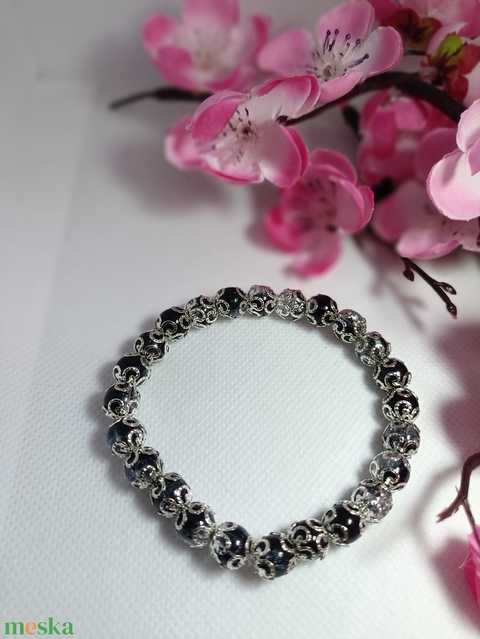 - Anyaga: rugalmas damil, töredezett hatású üvegygyöngy, virág gyöngy