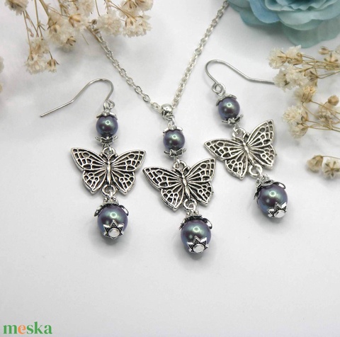 Lepkés nyaklánc és fülbevaló szett lila színű, színjátszó, gyöngyházfényű üveggyöngyökkel