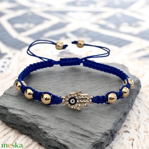 Csomózott makramé állítható méretű védelmező Hamsa kéz karkötő arany színű hematit gyöngyökkel sötétkék 5637353
