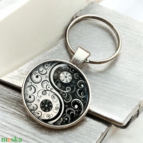 Üveglencsés fém kulcstartó - Jing Jang paisley mintás 5637356