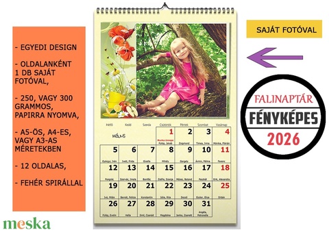 2026-os egyedi fényképes falinaptár nagyiknak, nagyszülőknek. Különleges tervezésű falinaptárammal szeretnék hozzájárulni az ajándékozás öröméhez. Vásárlásod után e-mailben megküldött visszaigazolásban fogom megírni neked, a naptár elkészítésének teljes menetét. Abban találod majd az elszámolást is, melyet előreutalással kell rendezned. A falinaptár 2 féle minőségben és 3 féle méretben (A5, A4, A3) készül. Mindkét minőség kiváló, 250 grammos, vagy 300 grammos papírra nyomódik, év végén sem fog a faltól felgöngyölődni. A falinaptár 12 oldalas, attól a hónaptól indul amelyikkel szeretnéd. Előlap külön ár ellenében kérhető! (450.-Ft/oldal) Szükséges fotók száma: 12 db